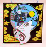 The goddess: Hard enamel gold plated featuring a wolf with green flaming sundisk behind them.