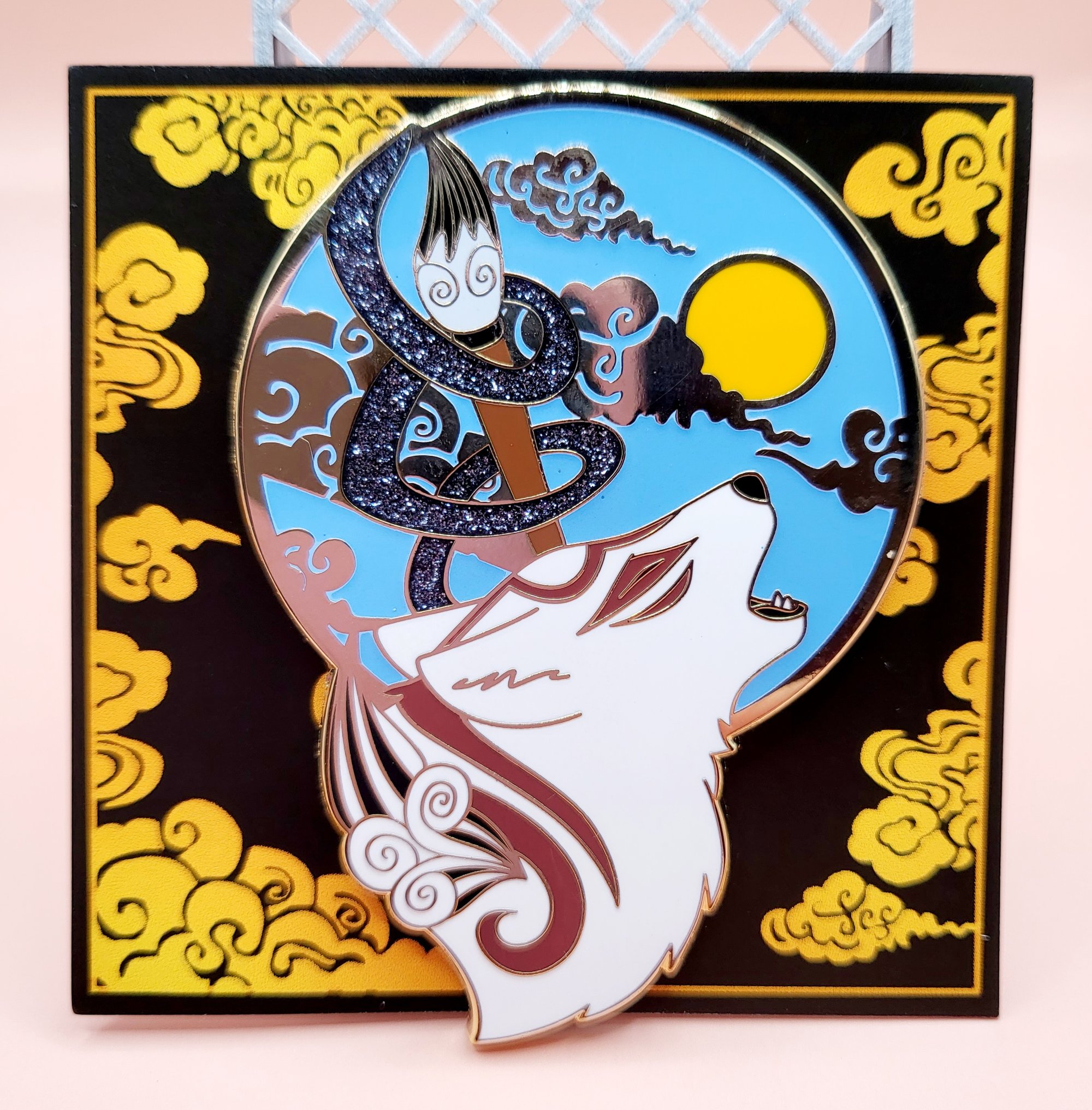 Night & Day: Gold plated hard enamel pin featuring a howling wolf with glitter brush stroke and glow sky.