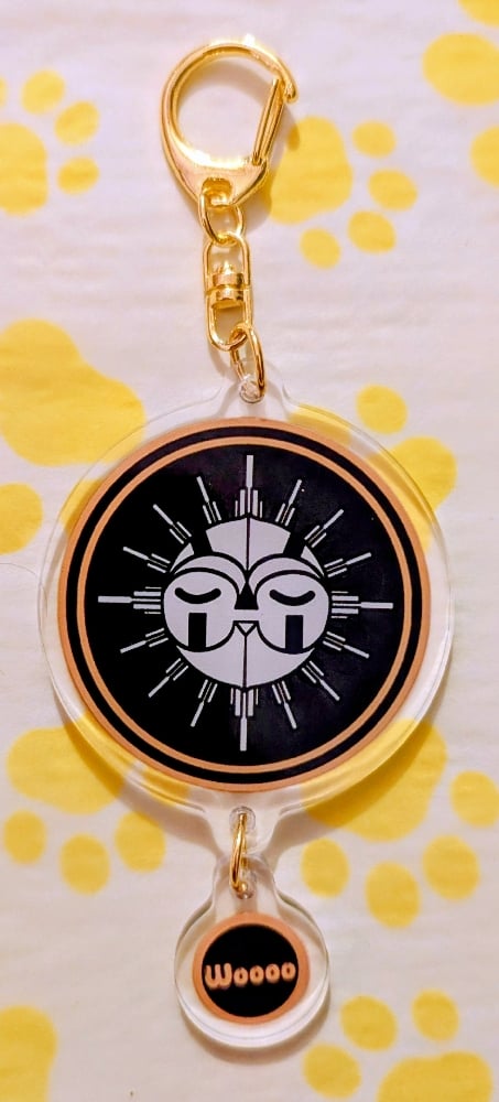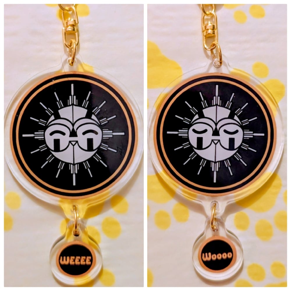 A double sided acrylic keyring featuring a dangle charm saying Weee/wooo on either side.